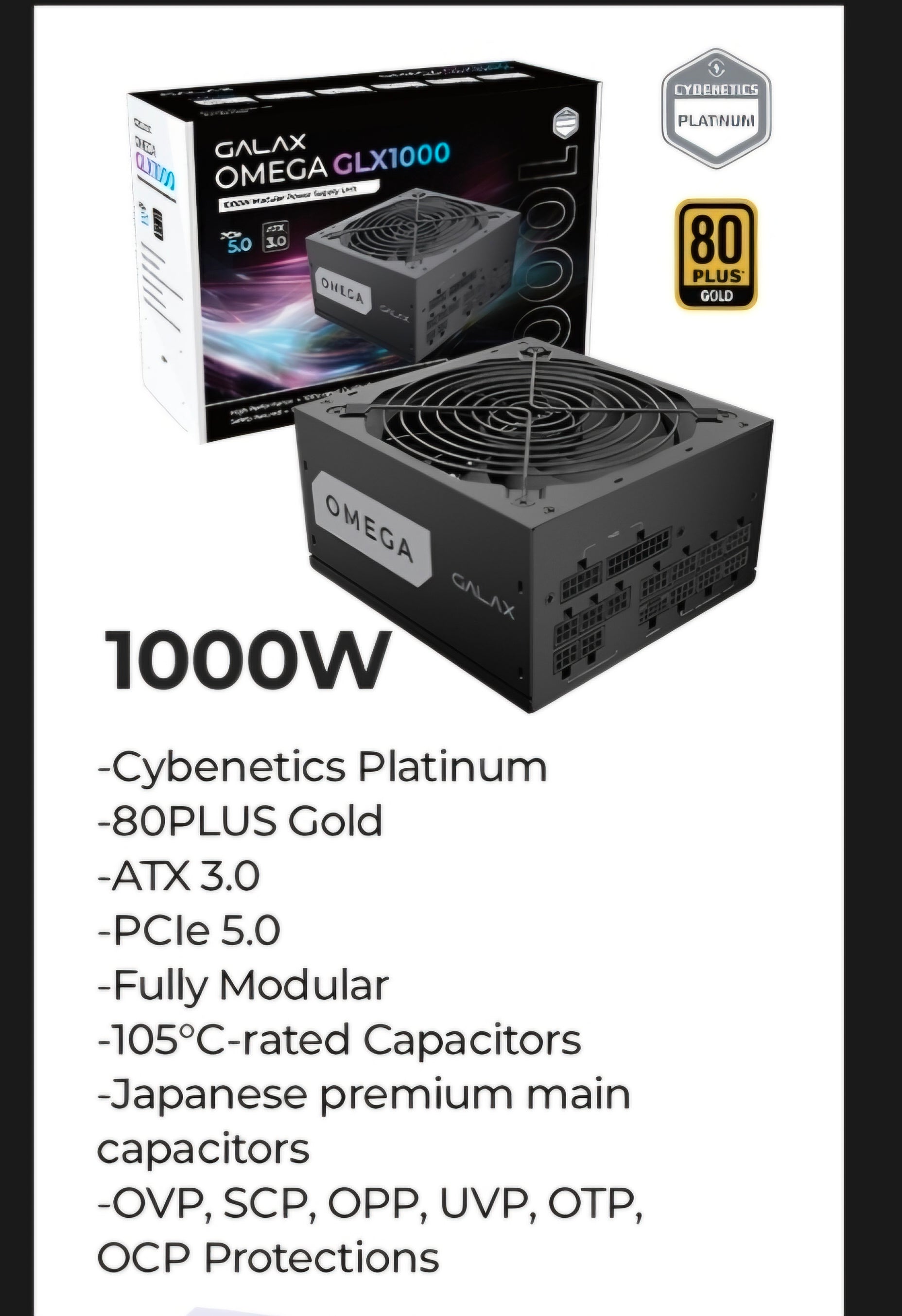 GALAX OMEGA GLX1000 Full Modular / 1000W / ATX 3.0 / Cybenetics Platinum Endorsed with the prestigious Platinum Efficiency Certifications... Read more